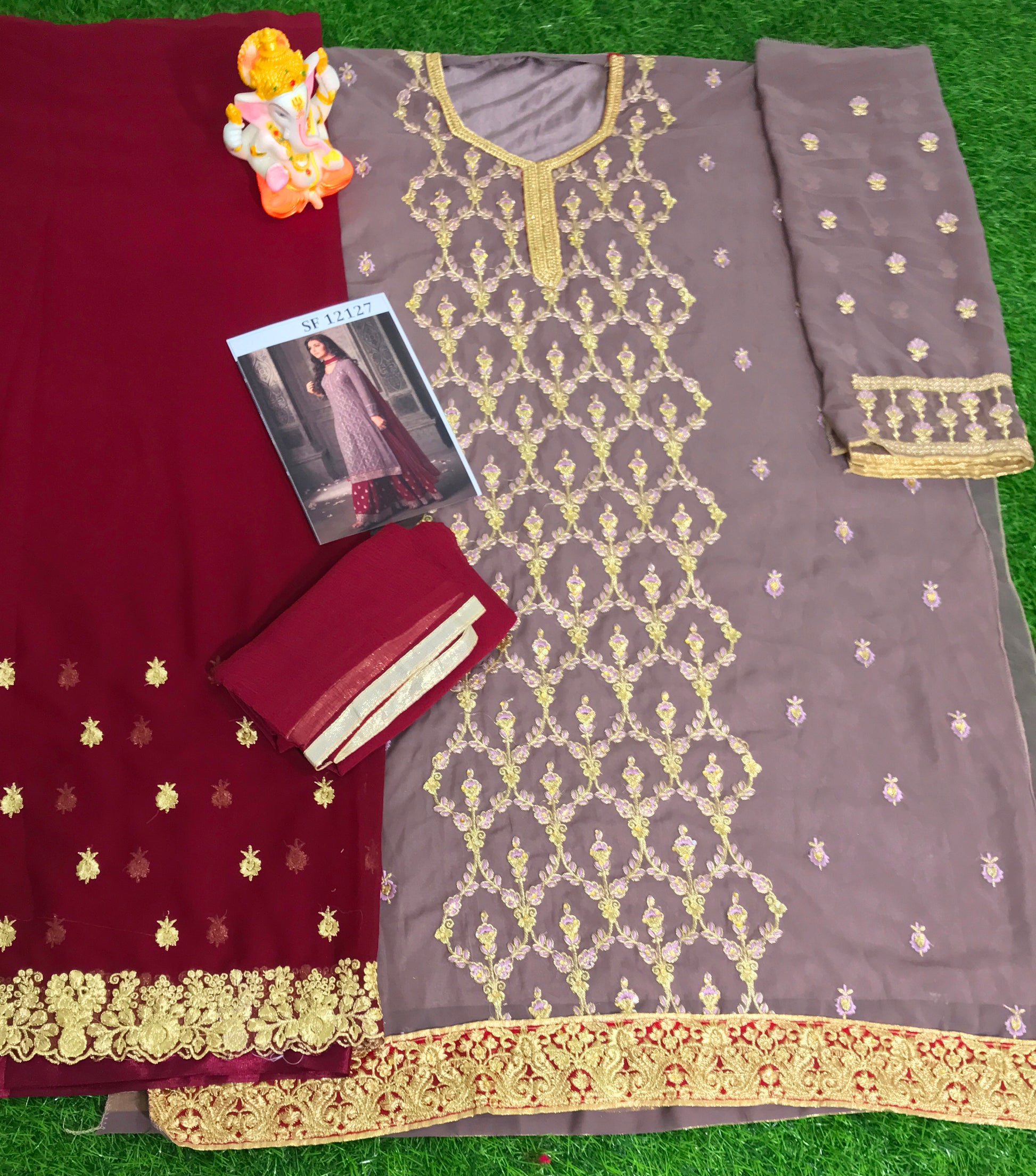 Top:- Heavy Georgette With Embroidery & Stone Work Top Length :- 46 Max up to Top Colour : Grey Top Type : Semi Stitch Size :- 44 Max up to Top Inner :- Santoon Sleeve: Georgette With Embroidery & Stone Sleeve Type : Full Sleeve Sarara :- Georgette With Embroidery & Stone Work sarara Colour : Maroon Sarara Lenght : 42 inch (2 Mtr) Sarara Type : Unstitch With Attched Inner Dupatta :- Nazneen with Lace Dupatta Colour : Maroon Dupatta Lenght : 2 Mtr This collection is semi stitched and free size, max chest set up to 44 inches. Please Note : Picture shown here is for reference only. Actual products may differ slightly in appearance and colour to images shown.