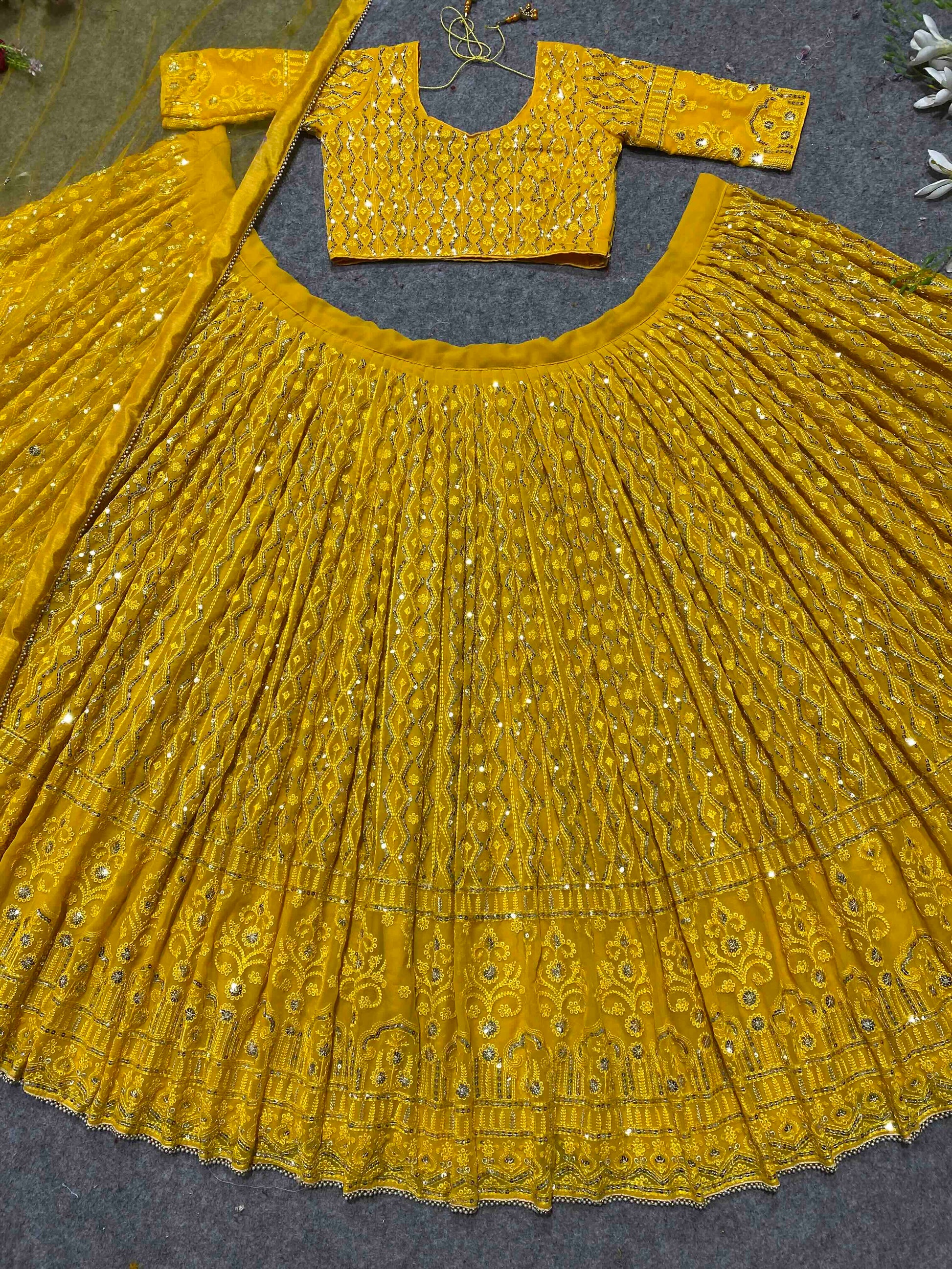 SHAFNUFAB Women's Georgette Semi Stitched lehengacholi SF201455 Diwali Outfit Embroidered lehengacholi Set Yellow1 Colour Indian Heavy Lehenga
