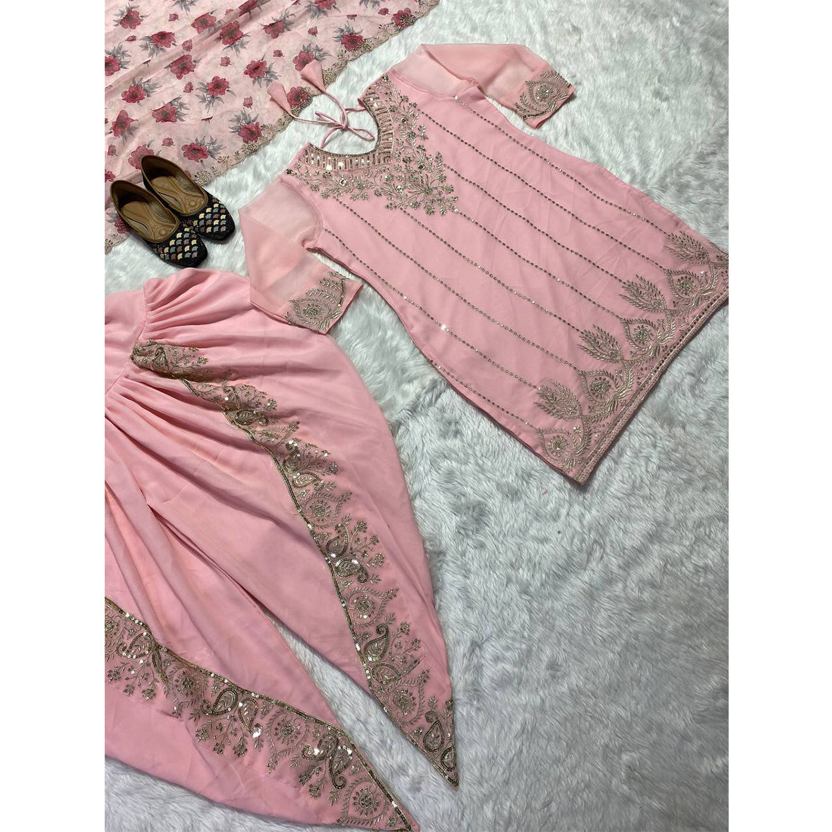 DHOTI SALWAR SHUIT Detail DHOTI SALWAR SHUIT Top Fabric:- Faux Georgette DHOTI SALWAR SHUIT Top Size:- Up To 42 Xl Free Size *(Fully Stiched) DHOTI SALWAR SHUIT Top Length :- 36 Inches DHOTI SALWAR SHUIT Top Inner:- Silk DHOTI SALWAR SHUIT Plazzo Fabric:- Faux Georgette DHOTI SALWAR SHUIT Plazzo Inner:- Silk DHOTI SALWAR SHUIT Plazzo Flair:- Xl size and Length is 43-44 DHOTI SALWAR SHUIT Dupatta Fabric:- Faux Georgette DHOTI SALWAR SHUIT Dupatta Length :- 2.20 Mtrs