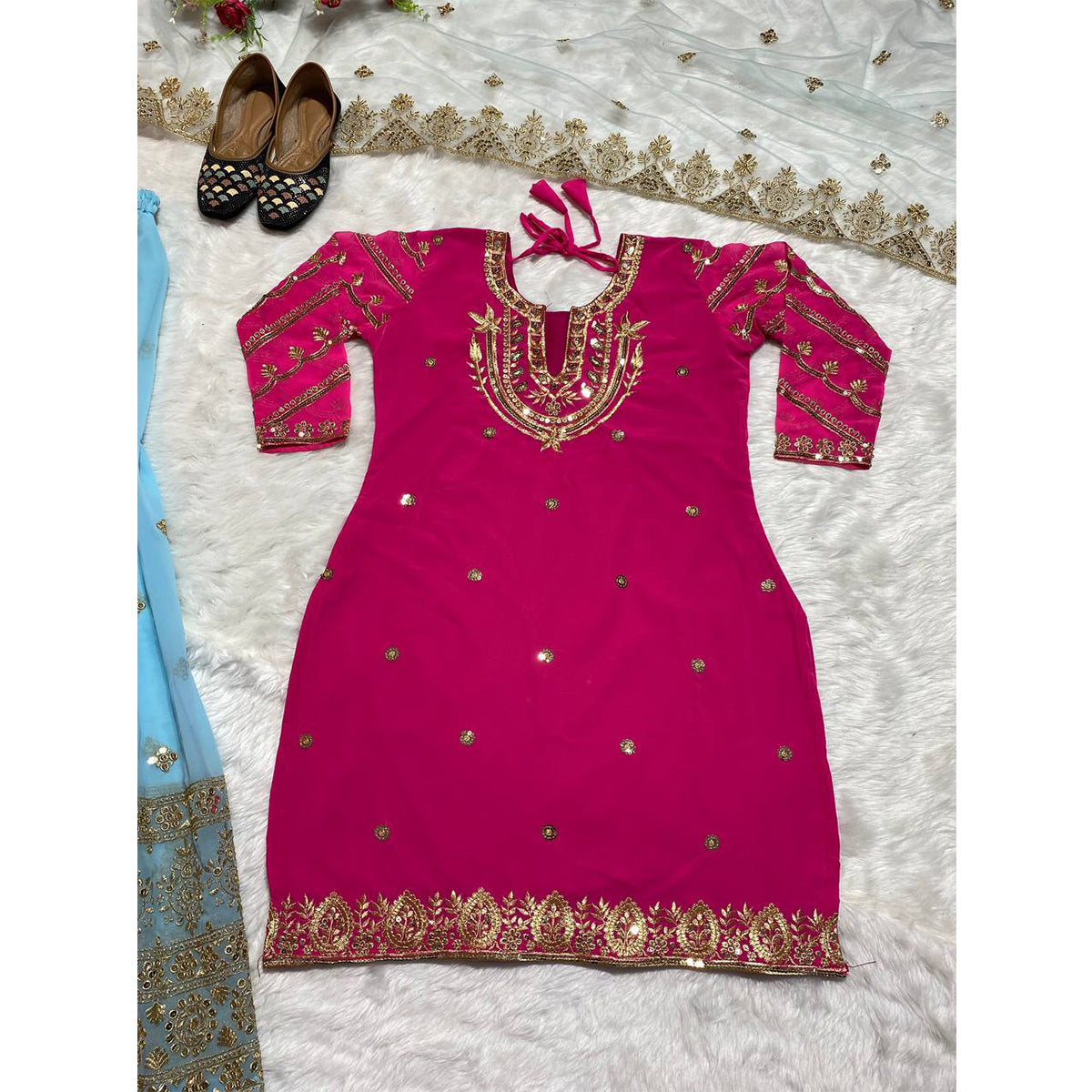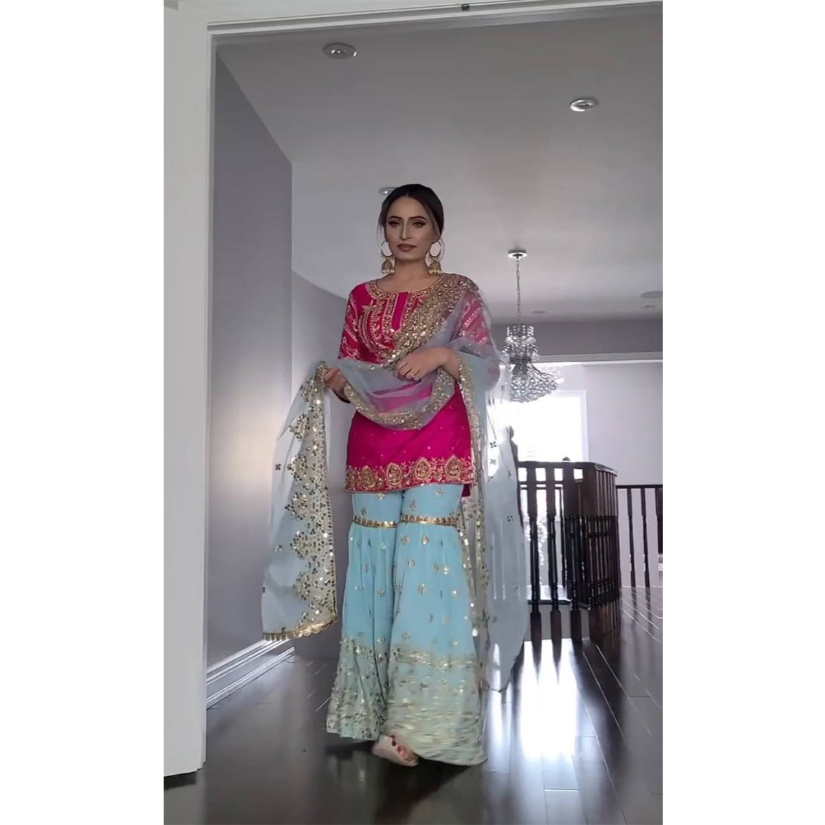 DHOTI SALWAR SHUIT Detail DHOTI SALWAR SHUIT Top Fabric:- Faux Georgette DHOTI SALWAR SHUIT Top Size:- Up To 42 Xl Free Size *(Fully Stiched) DHOTI SALWAR SHUIT Top Length :- 36 Inches DHOTI SALWAR SHUITTop Inner:- Silk DHOTI SALWAR SHUIT Plazzo Fabric:- Faux Georgette DHOTI SALWAR SHUIT Plazzo Inner:- Silk DHOTI SALWAR SHUIT Plazzo Flair:- Xl size and Length is 43-44 DHOTI SALWAR SHUIT Dupatta Fabric:- NET DHOTI SALWAR SHUIT Dupatta Length :- 2.20 Mtrs